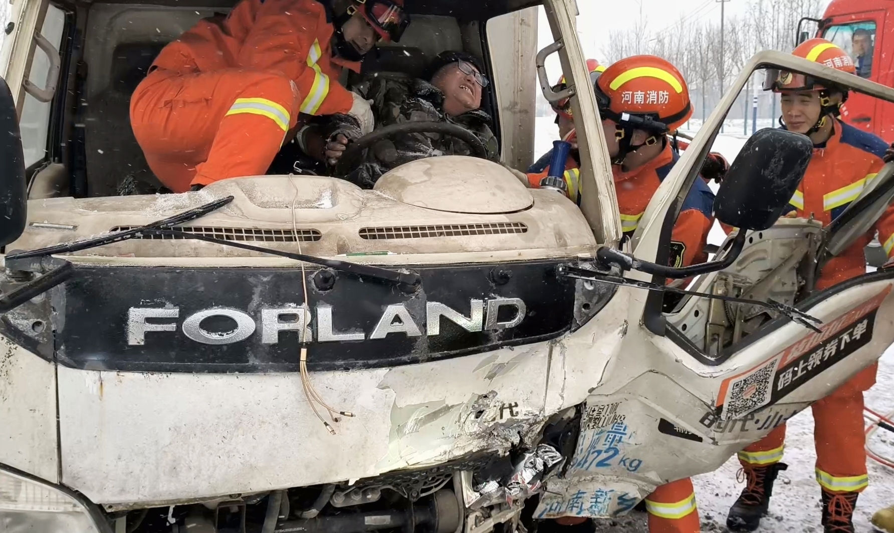 \u003c/p>\u003cp>時間就是生命!十萬火急之時,12名消防指戰員迅速集結,2輛消防車頂著暴雪呼嘯而出。途中與報警人焦急的通話中,關鍵信息不斷傳來:兩車劇烈相撞后車頭已完全扭曲變形,被困者腿部被死死卡在駕駛座與儀表盤之間,雖意識清醒,但每一次呼吸都伴隨著刺骨疼痛,暴雪還在持續,氣溫驟降至零度以下,若不及時救援,被困者隨時可能因失血或低溫陷入危險。\u003c/p>\u003cp>車輪碾過積雪覆蓋的路面,濺起半米高的雪霧,消防車在濕滑的道路上艱難前行。到達現場后,眼前的景象令人揪心:小型貨車與轎車呈90度角死死“咬”在一起,貨車車頭凹陷變形,左側車門被撞得如同揉皺的紙團,車窗玻璃碎渣混著積雪散落一地,貨車司機雙腿被變形的車門框架與座椅滑軌死死卡住,腳踝處已滲出血跡,若強行拖拽可能造成二次傷害。\u003c/p>\u003cp>\u003cimg src=\"https://x0.ifengimg.com/ucms/2026_05/8B04E8217E84D0F2D52951EA829B9E0112A2E2CA_size155_w1267_h843.jpg\" />\u003c/p>\u003cp>“一組用液壓擴張器撐開車門縫隙,二組拿剪切鉗剪斷變形鋼筋,三組隨時待命抬出傷員!”風雪中,指揮員果斷下達救援命令。戰斗員們迅速行動,液壓擴張器的“嗡嗡”聲刺破風雪,金屬與金屬的碰撞聲格外刺耳。戰斗員小張雙手緊握擴張器,將尖端精準嵌入車門縫隙,“發力!”隨著他的喝聲,擴張器緩緩撐開,變形的車門被硬生生頂出一道窄縫。另一名戰斗員將剪切鉗伸進縫隙,對準卡住腿部的鋼筋,“咔嚓”一聲脆響,鋼筋被成功剪斷。\u003c/p>\u003cp>救援中,被困者氣息逐漸急促,指揮員一邊觀察情況,一邊輕聲安撫:“堅持住,馬上就出來了,我們一直在!”經過近10分鐘的生死較量,阻礙救援的生命通道徹底暢通。消防員們小心翼翼地托住傷員的雙腿,緩緩將他從駕駛座移出,合力抬上擔架,踩著積雪快步沖向等候在旁的120救護車,一場驚心動魄的車禍救援圓滿成功。(劉成威 朱鋒亮 康飛 )\u003c/p>","type":"text"}],"currentPage":0,"pageSize":1},"editorName":"王聰兒","faceUrl":"http://ishare.ifeng.com/mediaShare/home/876322/media","vestAccountDetail":{},"subscribe":{"type":"vampire","cateSource":"","isShowSign":0,"parentid":"0","parentname":"傳媒","cateid":"876322","catename":"鳳凰網河南","logo":"http://d.ifengimg.com/q100/img1.ugc.ifeng.com/newugc/20171219/17/wemedia/0fc92208d7ced0e7fa170827f0650381ff366b11_size19_w200_h200.png","description":"鳳凰網河南,影響中原的力量。","api":"http://api.3g.ifeng.com/api_wemedia_list?cid=876322","show_link":1,"share_url":"https://share.iclient.ifeng.com/share_zmt_home?tag=home&cid=876322","eAccountId":876322,"status":1,"honorName":"","honorImg":"http://x0.ifengimg.com/cmpp/2020/0907/1a8b50ea7b17cb0size3_w42_h42.png","honorImg_night":"http://x0.ifengimg.com/cmpp/2020/0907/b803b8509474e6asize3_w42_h42.png","forbidFollow":0,"forbidJump":0,"fhtId":"92769226","view":1,"sourceFrom":"","declare":"","originalName":"","redirectTab":"article","authorUrl":"https://ishare.ifeng.com/mediaShare/home/876322/media","newsTime":"2026-01-26 16:57:22","lastArticleAddress":"來自河南"}},"keywords":"車門,擴張器,被困者,戰斗員,鋼筋,積雪,車頭,指揮員,縫隙,消防車","hasCopyRight":true,"sourceReason":"","isHubeiLocal":false,"interact":{"isCloseShare":false,"isCloseLike":false,"isOpenCandle":false,"isOpenpray":false},"__nd__":"ne883dbn.ifeng.com","__cd__":"c01049em.ifeng.com"};
