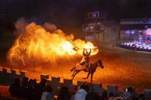 夜游的重頭戲當屬"牧野之戰·打鐵花"大型演藝。演出以商周牧野之戰為歷史背景,融合國家級非遺打鐵花與實景馬術,1600℃鐵水飛濺如星雨,與舞臺上的戰馬嘶鳴、刀光劍影形成視聽共振,同時以現代高科技舞臺特效,精彩刺激地展現中國戰將獨有的情懷和可歌可泣的精神。