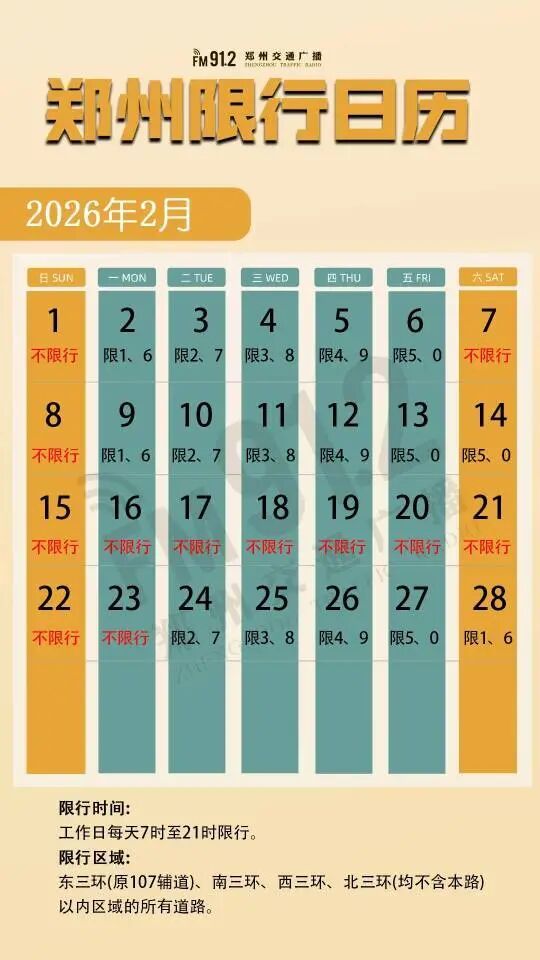\u003c/p>\u003cp>本周限行有調整\u003c/p>\u003cp>2月28日(本周六)調休正常上班,鄭州限行尾號為:1和6。\u003c/p>\u003cp>來源:河南交通廣播\u003c/p>","type":"text"}],"currentPage":0,"pageSize":1},"editorName":"王聰兒","faceUrl":"http://ishare.ifeng.com/mediaShare/home/876322/media","vestAccountDetail":{},"subscribe":{"type":"vampire","cateSource":"","isShowSign":0,"parentid":"0","parentname":"傳媒","cateid":"876322","catename":"鳳凰網河南","logo":"http://d.ifengimg.com/q100/img1.ugc.ifeng.com/newugc/20171219/17/wemedia/0fc92208d7ced0e7fa170827f0650381ff366b11_size19_w200_h200.png","description":"鳳凰網河南,影響中原的力量。","api":"http://api.3g.ifeng.com/api_wemedia_list?cid=876322","show_link":1,"share_url":"https://share.iclient.ifeng.com/share_zmt_home?tag=home&cid=876322","eAccountId":876322,"status":1,"honorName":"","honorImg":"http://x0.ifengimg.com/cmpp/2020/0907/1a8b50ea7b17cb0size3_w42_h42.png","honorImg_night":"http://x0.ifengimg.com/cmpp/2020/0907/b803b8509474e6asize3_w42_h42.png","forbidFollow":0,"forbidJump":0,"fhtId":"92769226","view":1,"sourceFrom":"","declare":"","originalName":"","redirectTab":"article","authorUrl":"https://ishare.ifeng.com/mediaShare/home/876322/media","newsTime":"2026-02-25 08:58:59","lastArticleAddress":"來自河南"}},"keywords":"鄭州,車主,日歷,河南","hasCopyRight":true,"sourceReason":"","isHubeiLocal":false,"interact":{"isCloseShare":false,"isCloseLike":false,"isOpenCandle":false,"isOpenpray":false},"__nd__":"ne883dbn.ifeng.com","__cd__":"c01049em.ifeng.com"};